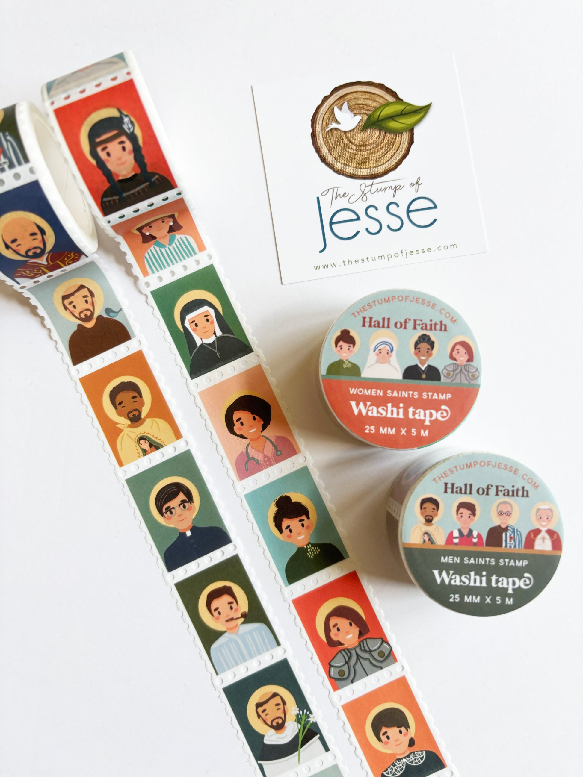 Add a touch of faith and color to your journaling, letters, crafts, or gifts with our Hall of Faith washi tape collection! Featuring a charming postage stamp design, each tape roll celebrates the lives of holy men and women who inspire us to live with courage, love, and trust in God. Each roll measures 25mm x 5m and is perfect for Catholic creatives, students, teachers, or anyone who wants to keep the saints close in their daily life.